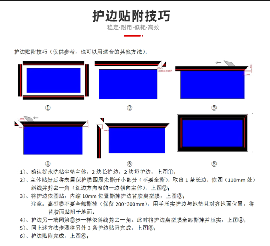 四周的红黑相间的边条,为过度封边,同时起一定的美化装饰作用,它表面没有粘性,它底面有3M双面不干胶,只需让它与水洗粘尘垫左右相互紧靠、撕去保护膜贴附于地面就行,不建议压边贴附;